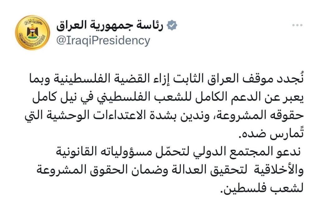 وقالت رئاسة الجمهورية في بيان”اننا نُجدد موقف العراق الثابت إزاء القضية الفلسطينية وبما يعبر عن الدعم الكامل للشعب الفلسطيني في نيل كامل حقوقه المشروعة، وندين بشدة الاعتداءات الوحشية التي تًمارس ضده.