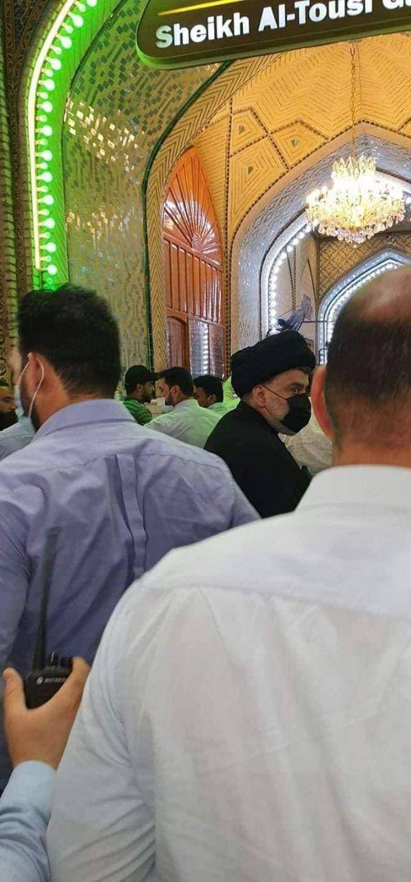 أظهرت مجموعة من الصور زعيم التيار الصدري مقتدى الصدر وهو يؤدي زيارة مرقد الإمام علي بمدينة النجف ليلة الجمعة.