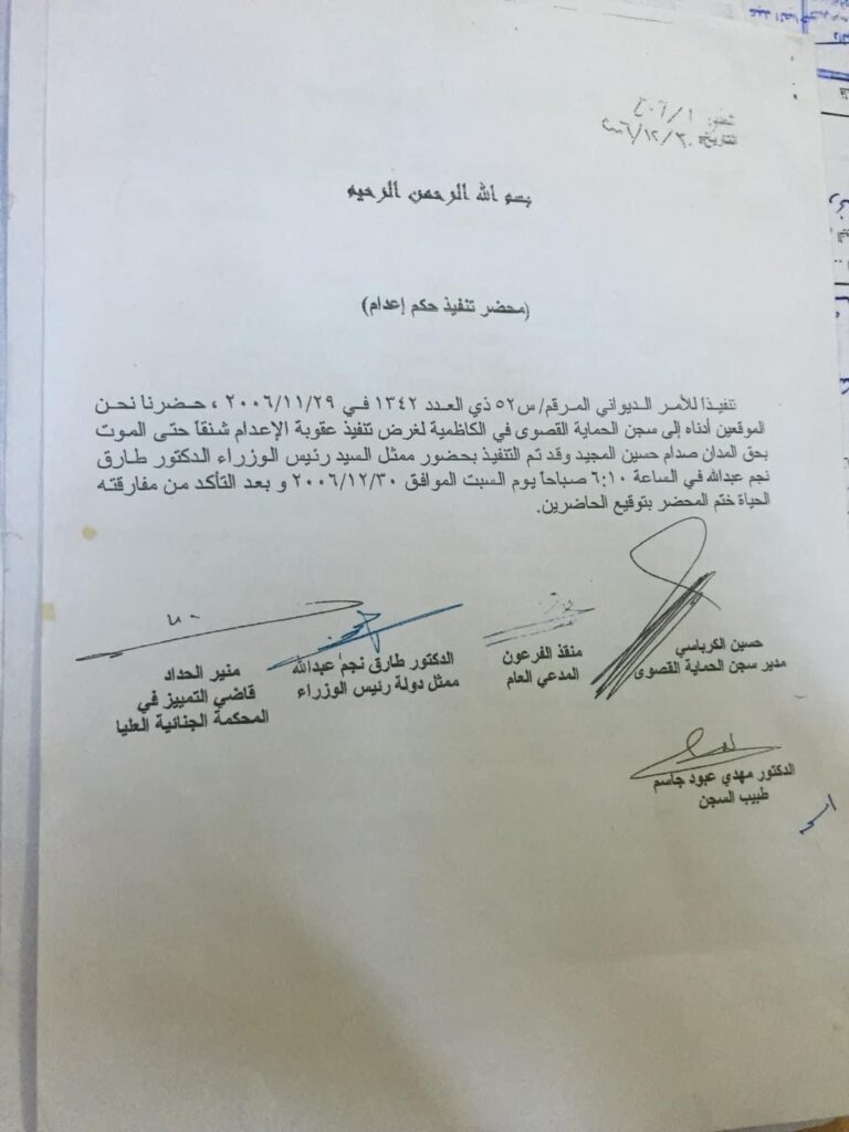 “صورة تعرض لأول مرة في لحظة اعدام صدام”، وأضاف: “القاضي منير حداد يتلو قرار التمييز باعدام صدام بحضور المدعي العام منقذ ال فرعون”.
