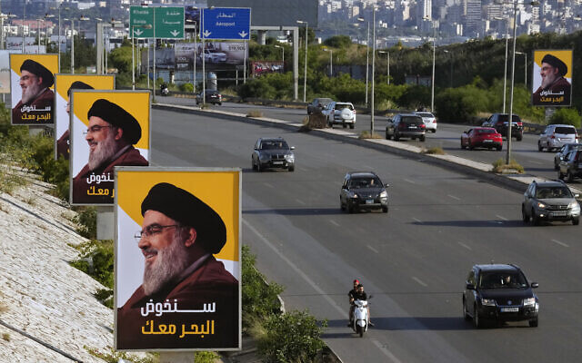 Vehicles drive past billboards depicting Lebanon's Hezbollah leader Sayyed Hassan Nasrallah, ahead of parliamentary election, in Beirut, Lebanon May 13, 2022. REUTERS/Aziz Taher