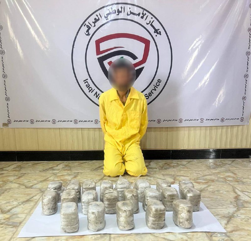 وقال بيان للجهاز إنه “ضمن الجهود المكثفة للحد من ظاهرة انتشار المخدرات؛ تمكنت قوة من جهاز الأمن الوطني في غرب محافظة نينوى بعد ورود المعلومات الاستخبارية واستحصال الموافقات القضائية من إلقاء القبض على تاجر مخدرات بحوزته نحو (25) كغم من مادة الحشيشة، وبعد نصب كمين محكم أسفر عن إلقاء القبض عليه”.