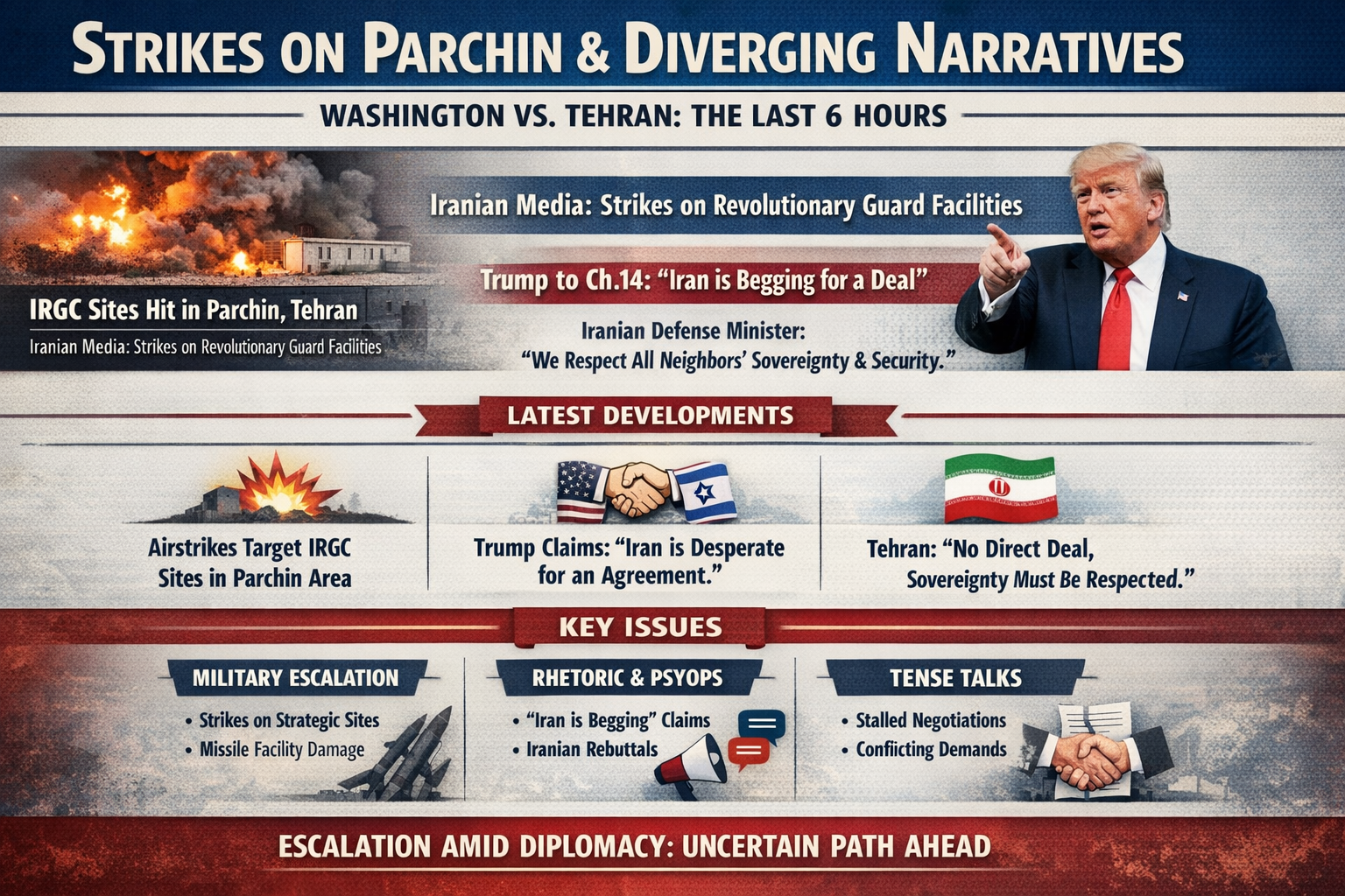 في تطور متسارع خلال الساعات الست الأخيرة، تصاعدت حدة التوتر بين الولايات المتحدة وإيران، مع ورود تقارير عن استهداف مواقع للحرس الثوري في بارتشين شرق طهران، بالتزامن مع تصريحات أمريكية تؤكد اقتراب اتفاق، يقابلها نفي وتحفظ إيراني رسمي يعكس عمق التباين في المشهد السياسي والعسكري.
