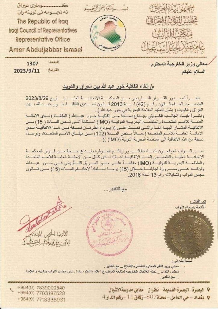 <!-- wp:paragraph {"fontSize":"medium"} --> <p class="has-medium-font-size">حرية – (23/9/2023)</p> <!-- /wp:paragraph --> <!-- wp:paragraph {"fontSize":"medium"} --> <p class="has-medium-font-size">وجه مجلس النواب ، طلبا رسميا مرفقا بتواقيع اكثر من 145 نائباً عن كتل مختلفة ، لمطالبة وزارة الخارحية بتدويل قرار المحكمة الاتحادية بشأن الغاء اتفاقية "خور عبد الله " بين العراق والكويت.</p> <!-- /wp:paragraph --> <!-- wp:image {"id":126973,"sizeSlug":"large","linkDestination":"none"} --> <figure class="wp-block-image size-large"><img src="https://huria.news/wp-content/uploads/2023/09/image-114-724x1024.png" alt="" class="wp-image-126973"/></figure> <!-- /wp:image --> <!-- wp:image {"linkDestination":"custom"} --> <figure class="wp-block-image"><a href="https://ninanews.com/Website/News/Details?Key=1079368#" target="_blank" rel="noreferrer noopener"><img src="https://images.weserv.nl/?url=ninanews.net/Uploads/Images/2023/9/1079368-70d0f28b-f66a-4388-bb5a-cc07f2412f17.jpeg&w=570&h=253&t=absolute" alt=""/></a></figure> <!-- /wp:image --> <!-- wp:image {"linkDestination":"custom"} --> <figure class="wp-block-image"><a href="https://ninanews.com/Website/News/Details?Key=1079368#" target="_blank" rel="noreferrer noopener"><img src="https://images.weserv.nl/?url=ninanews.net/Uploads/Images/2023/9/1079368-a352da43-447c-456e-9add-58201446376d.jpeg&w=570&h=253&t=absolute" alt=""/></a></figure> <!-- /wp:image --> <!-- wp:image {"linkDestination":"custom"} --> <figure class="wp-block-image"><a href="https://ninanews.com/Website/News/Details?Key=1079368#" target="_blank" rel="noreferrer noopener"><img src="https://images.weserv.nl/?url=ninanews.net/Uploads/Images/2023/9/1079368-d764c679-4b12-4cd9-bb1f-814ee9f0ee62.jpeg&w=570&h=253&t=absolute" alt=""/></a></figure> <!-- /wp:image --> <!-- wp:image {"linkDestination":"custom"} --> <figure class="wp-block-image"><a href="https://ninanews.com/Website/News/Details?Key=1079368#" target="_blank" rel="noreferrer noopener"><img src="https://images.weserv.nl/?url=ninanews.net/Uploads/Images/2023/9/1079368-1da6d5cf-e505-4430-892d-539290499189.jpeg&w=570&h=253&t=absolute" alt=""/></a></figure> <!-- /wp:image -->