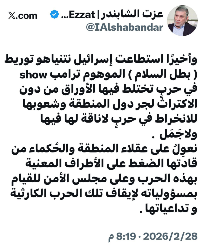 — عزت الشابندر | Ezzat Alshabandar (@IAlshabandar) February 28, 2026