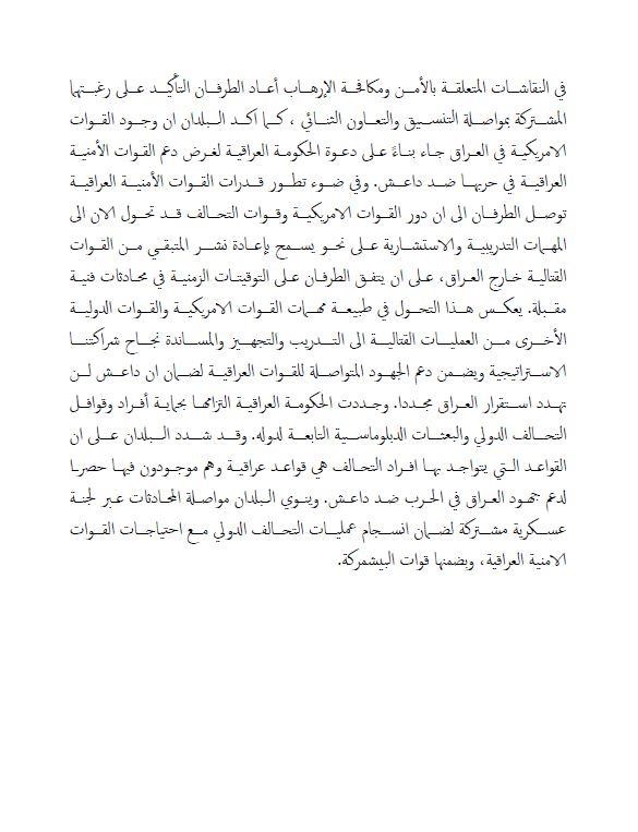 وجددت الحكومة العراقية “التزامها بحماية أفراد وقوافل التحالف الدولي والبعثات الدبلوماسية التابعة لدولها، وقد شدد البلدان على أن القواعد التي يتواجد بها أفراد التحالف هي قواعد عراقية وهم موجودون فيها حصرا لدعم جهود العراق في الحرب ضد داعش، وينوي البلدان مواصلة المحادثات عبر لجنة عسكرية مشتركة لضمان انسجام عمليات التحالف الدولي مع احتياجات القوات الامنية العراقية، وبضمنها قوات البيشمركة”.