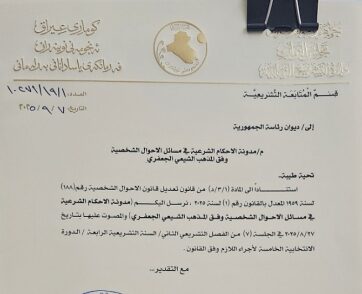 اعلنت الامانةً العامة لمجلس النواب ، عن ارسال “مدونة الاحكام الشرعية في مسائل الاحوال الشخصية على وفق المذهب الجعفري” الى رئاسة الجمهورية لغرض مصادقتها تمهيدا للنشر في جريدة الوقائع الرسمية.