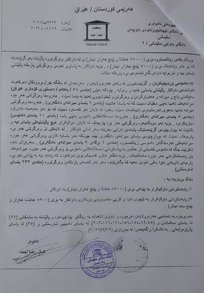 قضت محكمة بداءة السليمانية في إقليم كوردستان، يوم الأربعاء، ببطلان العقد المبرم بين وزارة العدل وإحدى شركات القطاع الخاص التي تقوم باستحصال الأموال من المواطنين.