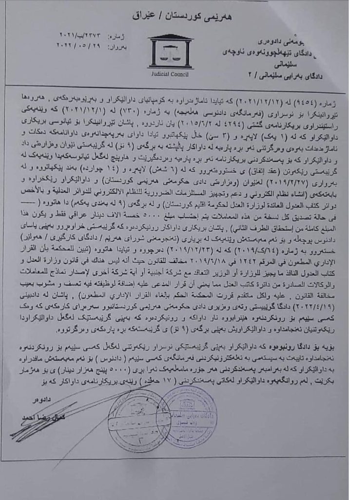 محكمة السليمانية تبطل عقدا لوزارة العدل مع شركة خاصة + وثائق