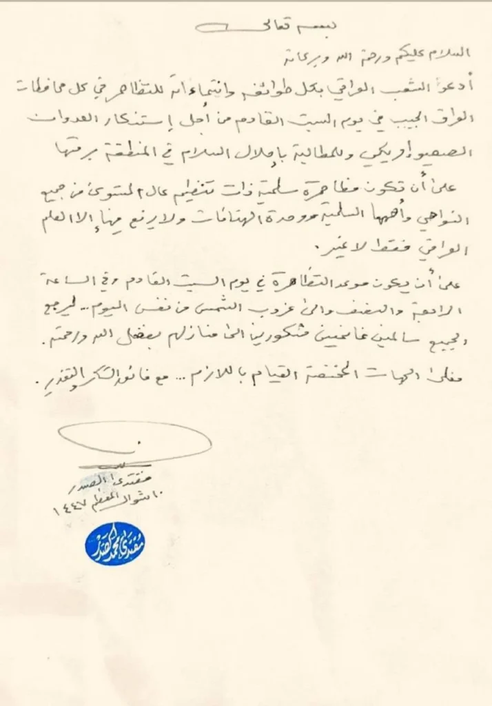 وشدد على ضرورة أن تكون التظاهرات “سلمية ومنظمة بشكل عالٍ”، مع التأكيد على وحدة الشعارات، وعدم رفع أي رايات سوى العلم العراقي.