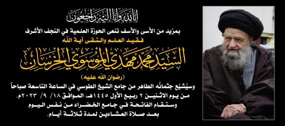 اعلن مكتب سماحة المرجع الديني الاعلى السيد علي السيستاني الحداد لمدة ثلاثة أيام لرحيل العلامة مهدي الخرسان.