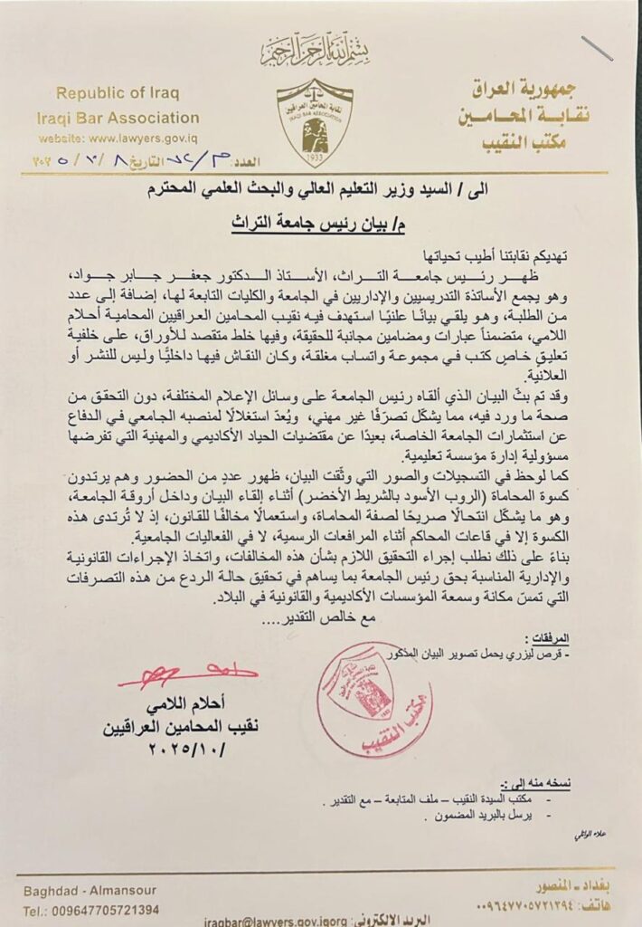 قدّمت نقابة المحامين العراقيين طلباً رسمياً إلى وزير التعليم العالي والبحث العلمي لفتح تحقيق عاجل بحق رئيس جامعة التراث الأهلية الدكتور جعفر جابر جواد، على خلفية بيان أصدره وتضمّن – بحسب النقابة – “عبارات غير مهنية ومغالطات مسيئة” استهدفت نقيب المحامين أحلام اللامي وعدداً من أعضاء النقابة.