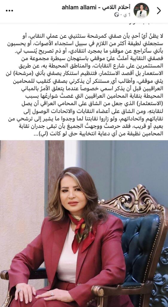 وفي السياق ذاته، نشرت اللامي على صفحتها في “فيسبوك” منشوراً بعنوان “التلاعب بالأدوار”، أكدت فيه تمسّكها بدورها النقابي رغم كونها مرشحة انتخابية، قائلة: