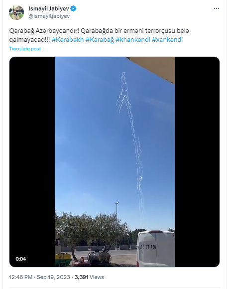 لكن مجموعة “التقنية من أجل السلام” المختصة بكشف الاخبار المزيفة، أكدت أن “الادعاء المرفق غير صحيح، إذ وعلى الرغم من أن اللغة المسموعة بالفيديو ليست عربية كما هو واضح، إلا أن المقطع سبق أن شاركه نائب مدير إدارة الإعلام في وكالة البث التلفزيوني والإذاعي العامة الأذربيجانية (إسماعيل جابييف) ظهر أمس 19 أيلول 2023، مرفق بنص مفاده (قره باغ هي أذربيجان ! لن يبقى حتى إرهابي أرمني واحد في قره باغ)”.