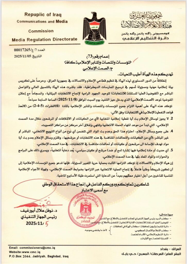 أعلنت هيأة الإعلام والاتصالات، اليوم الأربعاء، عن دخول البلاد مرحلة الصمت الانتخابي اعتبارًا من منتصف ليل السبت المقبل (8 تشرين الثاني 2025)، وذلك استعدادًا لإجراء انتخابات مجلس النواب العراقي المقررة في 11 تشرين الثاني الجاري.