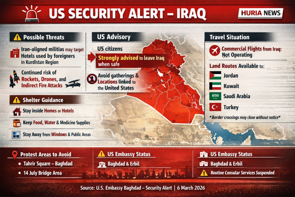 أصدرت سفارة الولايات المتحدة في بغداد، الجمعة 6 آذار 2026، تحذيراً أمنياً جديداً دعت فيه المواطنين الأمريكيين الموجودين في العراق إلى مغادرة البلاد في أقرب وقت ممكن عندما يكون ذلك آمناً، في ظل تصاعد المخاطر الأمنية واستمرار التوترات في المنطقة.