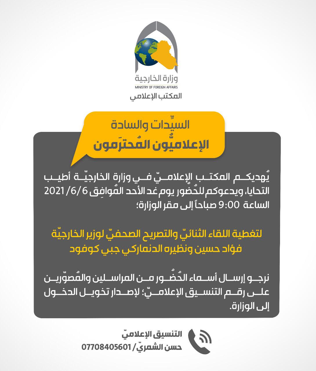 ودعت الوزارة، الإعلاميين، إلى “تغطية اللقاء الثنائي بين وزير الخارجية فؤاد حسين ونظيره الدنماركي يوم غد، في مقر الوزارة.