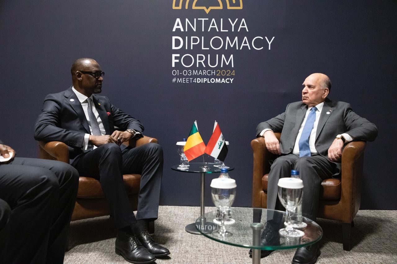 وقال وزير الخارجية خلال لقائه وزير الخارجية والتعاون الدولي في جمهورية مالي عبدالله ديوب، على هامش أعمال منتدى أنطاليا الدبلوماسي الثالث المنعقد بمدينة أنطاليا التركية. سعي العراق لتعزيز علاقاته السياسية مع دول القارة الأفريقية ولاسيما جمهورية مالي، مبدياً استعداد العراق للتعاون في المجال الأمني والاستخباري مع جمهورية مالي، واستعداد الموسسات الأمنية العراقية لنقل خبرتها وتجربتها في مكافحة التنظيمات الإرهابية إلى الجهات والمؤسسات الأمنية المعنية في جمهورية مالي.