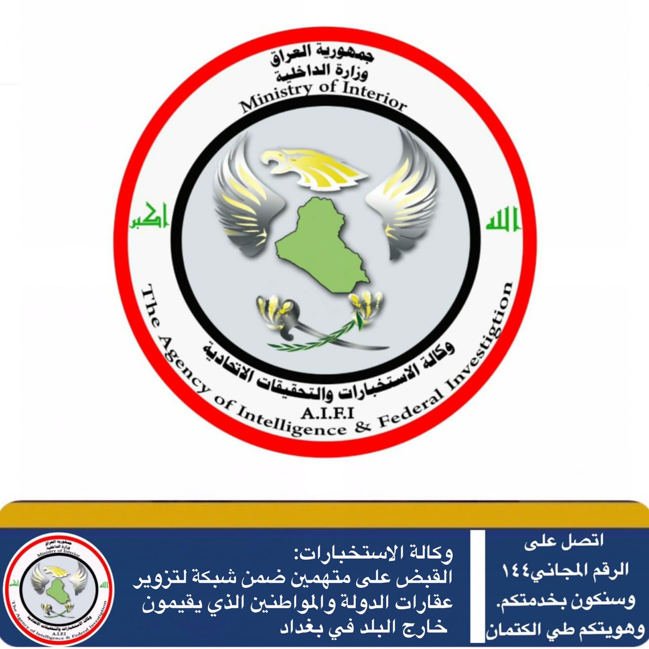 أعلنت وكالة الاستخبارات والتحقيقات الاتحادية، يوم السبت، إلقاء القبض على متهمين اثنين في بغداد ضمن شبكة لتزوير عقارات الدولة والمواطنين الذي يقيمون خارج العراق.