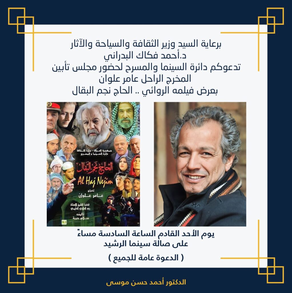 برعاية وزير الثقافة العراقي احمد فكاك البدراني تقيم دائرة السينما والمسرح مجلس تأبين للمخرج العراقي الراحل عامر علوان يوم الاحد المصادف 8/7/2023 الساعة السادسة مساءً.